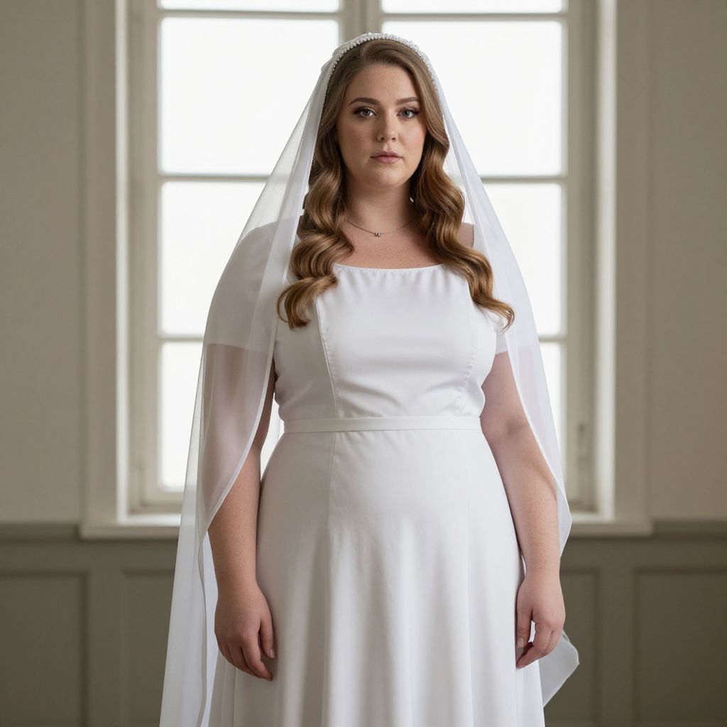 Photograph of a plus-sized, fair-skinned woman with long brown hair in a white wedding dress and veil, standing in front of a sunlit