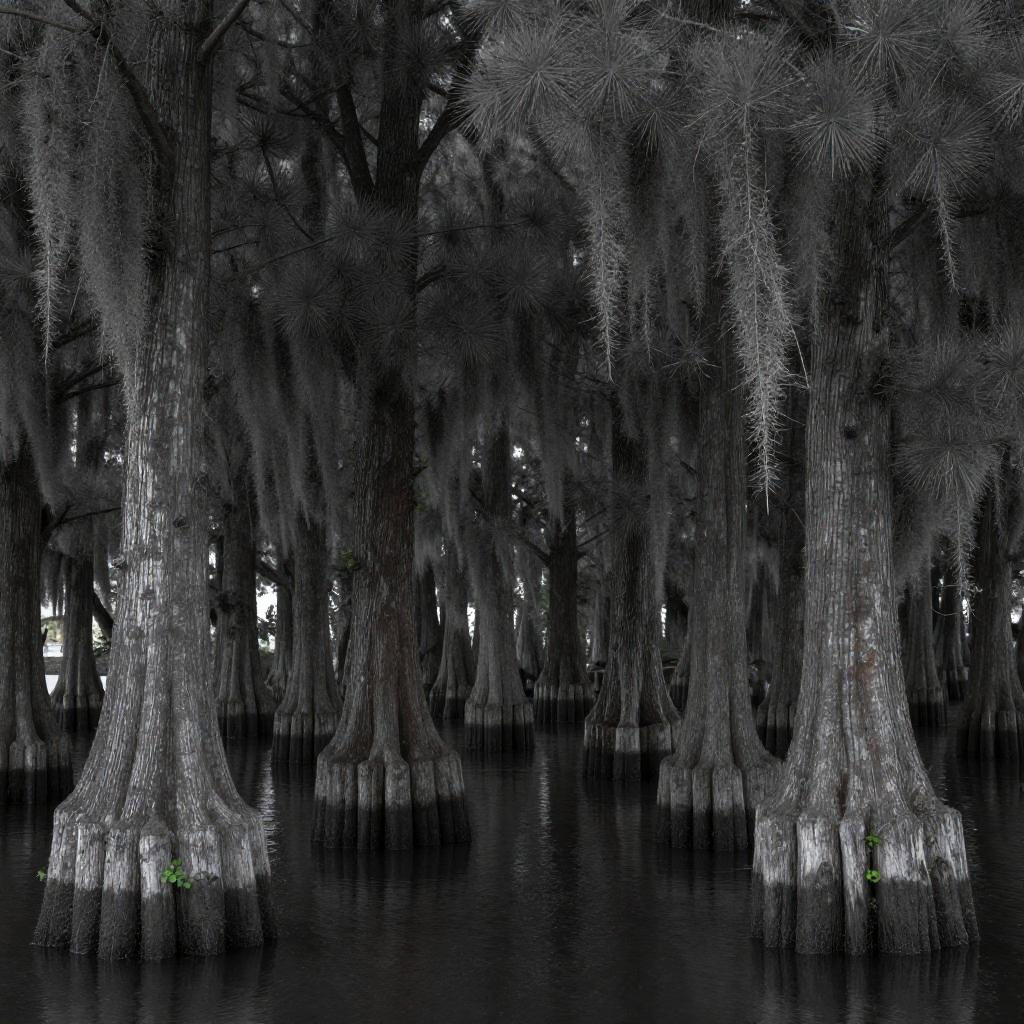 This is a digital artwork depicting a dense cypress forest. Tall, gray cypress trees with thick, knobby roots stand in dark, reflective water. The trees are covered in hanging Spanish moss, creating a textured, almost misty appearance. Small patches of green are visible among the roots, adding a touch of color to the otherwise monochromatic scene. The overall mood is tranquil and mysterious.