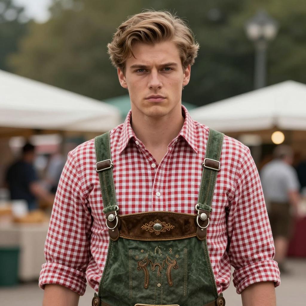 Oktoberfest dress man, photograph of a bearded man, wearing a straw hat, red and white checkered shirt, brown apron dress with suspenders, blue garters, black knee-high socks, brown shoes, standing in a sunlit indoor hall, hands behind back, background has white wall, black arch, green plants, another person in red dress to the left, wooden floor, warm sunlight, realistic, historical costume, rustic, portrait, full body, centered composition, casual pose