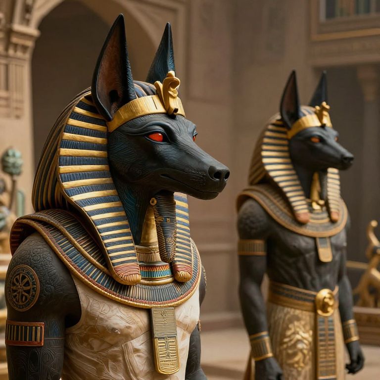 Photorealistic CGI of two black, anthropomorphic Anubis statues with red eyes, golden accents, striped nemes, and detailed ancient Egyptian attire