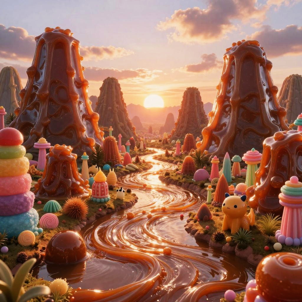 Surreal fantasy world made of caramelo, giant caramel rivers flowing between candy mountains, shimmering caramel glaze reflecting magical sunset, whimsical candy creatures around, vibrant colors, dreamy and imaginative landscape