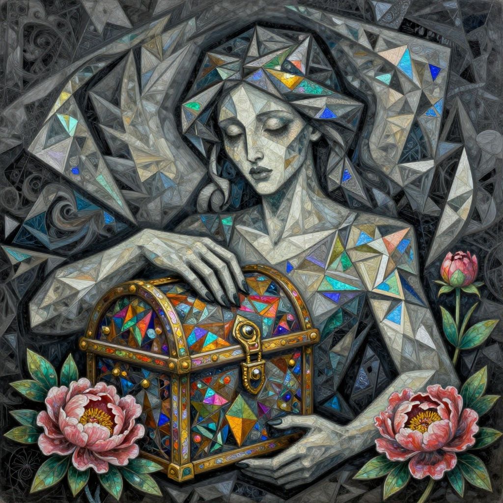 This digital art piece depicts a ethereal, gray-skinned woman with closed eyes and delicate features, holding a colorful, gemstone-studded treasure chest. Her fingers rest gently on the chest's golden lock. Surrounding her are jagged, crystalline shapes in various hues, and she has a crown-like arrangement of these crystals on her head. Pink peonies with green leaves are positioned at the bottom, adding a touch of softness. The background is dark and swirling, enhancing the mystical ambiance. The style is a vivid, high-contrast, and highly detailed digital illustration, blending fantasy and surrealism.