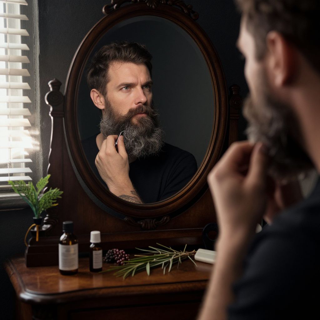 Photograph of a bearded man with dark hair, standing in front of an ornate oval mirror. He is adjusting his beard with his right hand, looking intently at his reflection. The man wears a black shirt. The mirror is mounted on a dark wooden dresser adorned with small glass bottles, a pine branch, and a white cloth. Light from a window with white blinds on the left side casts soft shadows. The background is dark, highlighting the man's face and the mirror's reflection. The image has a moody, introspective atmosphere.