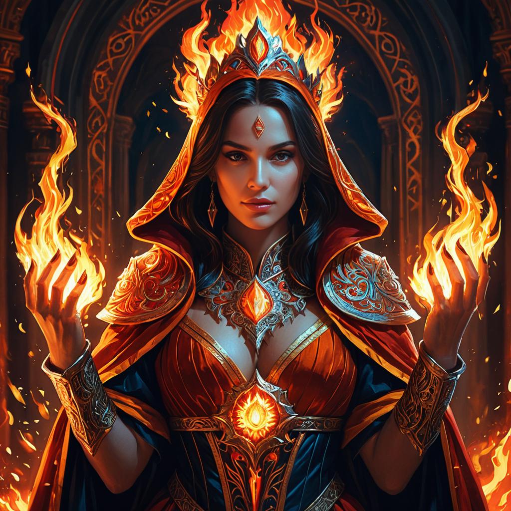 A highly detailed digital painting of a beautiful female pyromancer radiating a majestic fiery aura. She is dressed in ornate royal robes with intricate designs, wearing a flaming crown and holding flames in both hands. The artwork features deep vibrant colors and sharp focus in a photorealistic style, set against a mystical, ancient architectural backdrop.