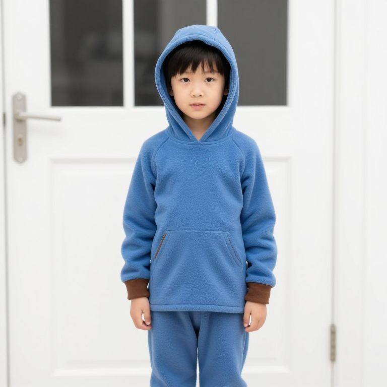 Boy wearing a blue and brown pajama set with a hoodie on his head. He is standing in front of a white door with a window.