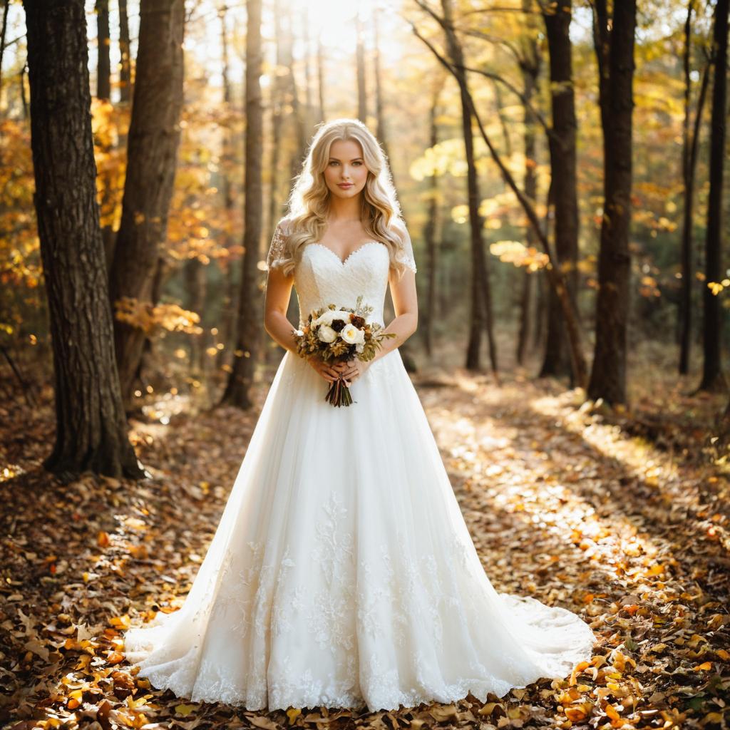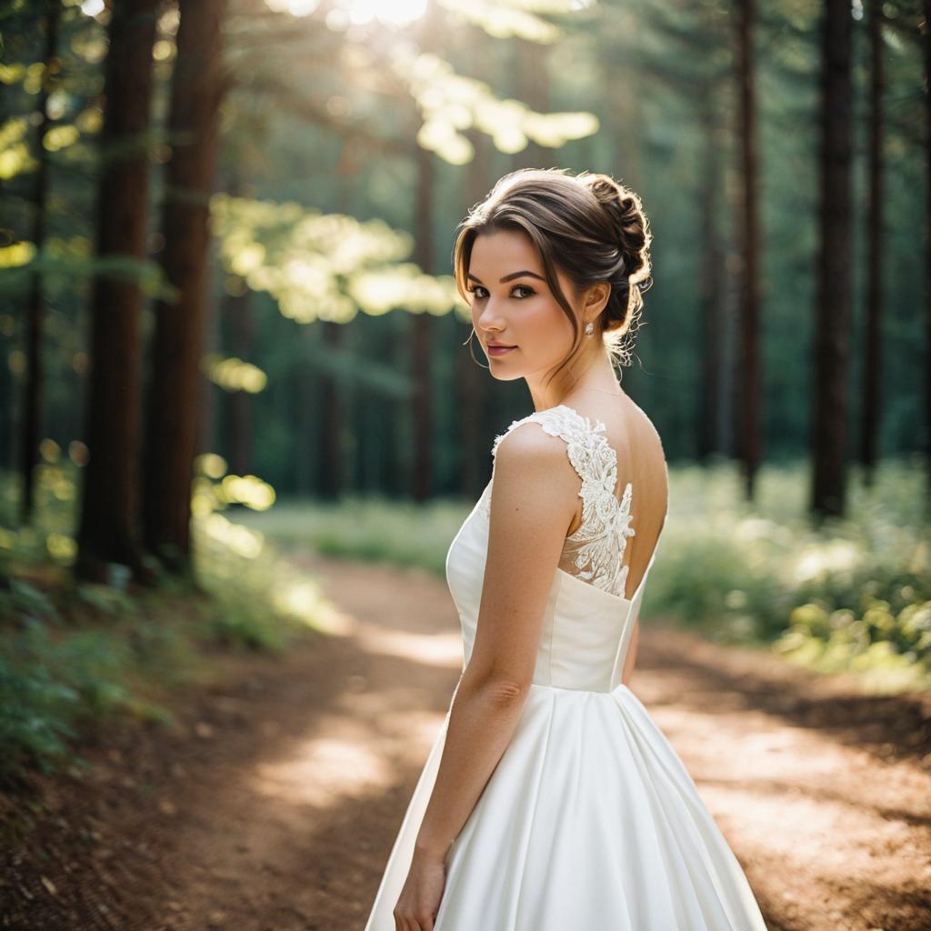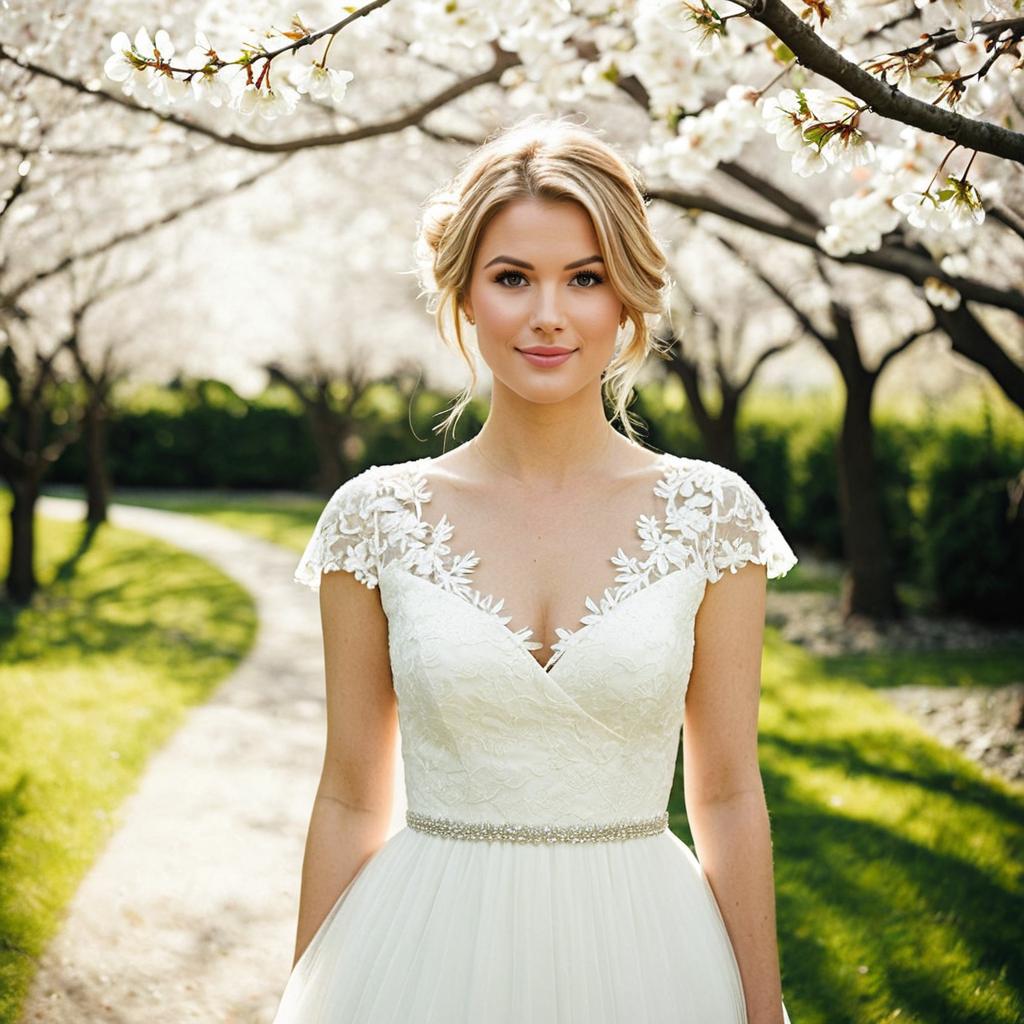 Bride dress elegant, photograph of a beautiful young woman, fair skin, blonde hair in an elegant updo, wearing a white, lace-trimmed, V-neck, short-sleeved wedding dress, standing in a sunny garden, surrounded by blooming white cherry blossoms, soft sunlight filtering through trees, green grass and blurred path in the background, serene and romantic atmosphere, gentle smile, natural light, springtime setting, realistic style, bridal portrait, detailed ures in dress and flowers, soft focus on background, daytime, tranquil and elegant mood