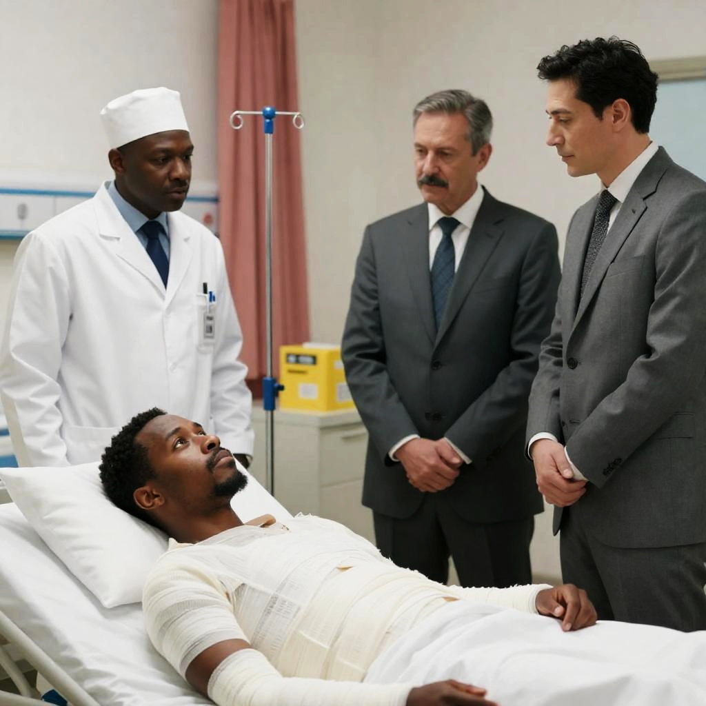 Photograph of a hospital room. Three men: Black man in white suit and cap, Brown man with mustache in gray suit, Black man in white bandages lying in bed. Bandaged man looks up, others focus on conversation. Window with red curtains, IV stand, yellow boxes in background.