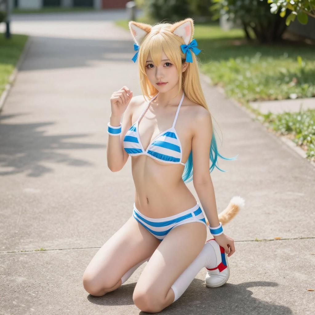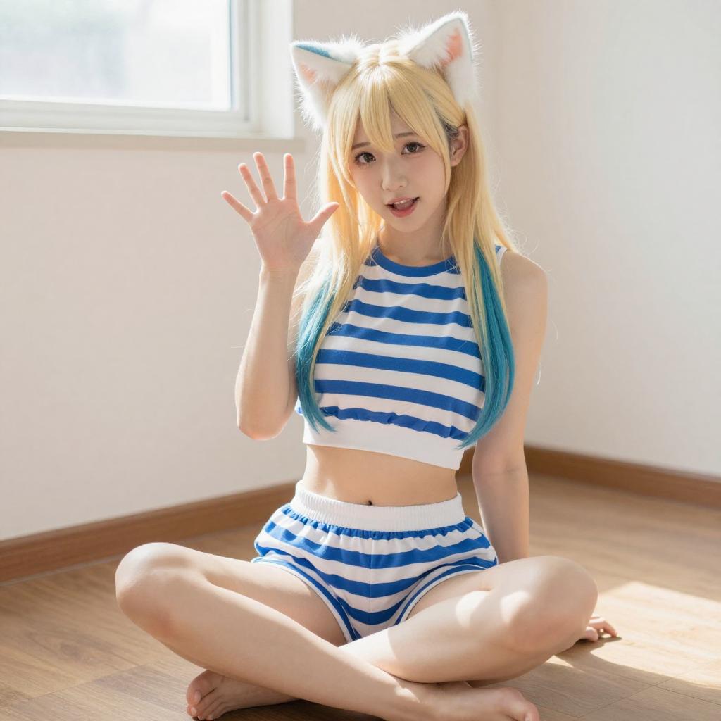 Photograph of a young woman with long blonde hair, blue eyes, and white fox ears, wearing a white crop top with frilled edges, white and navy blue shorts, and a navy blue bow on her head. She sits on a wooden floor in front of a window, touching her cheek with her right hand. Bright natural light illuminates her.