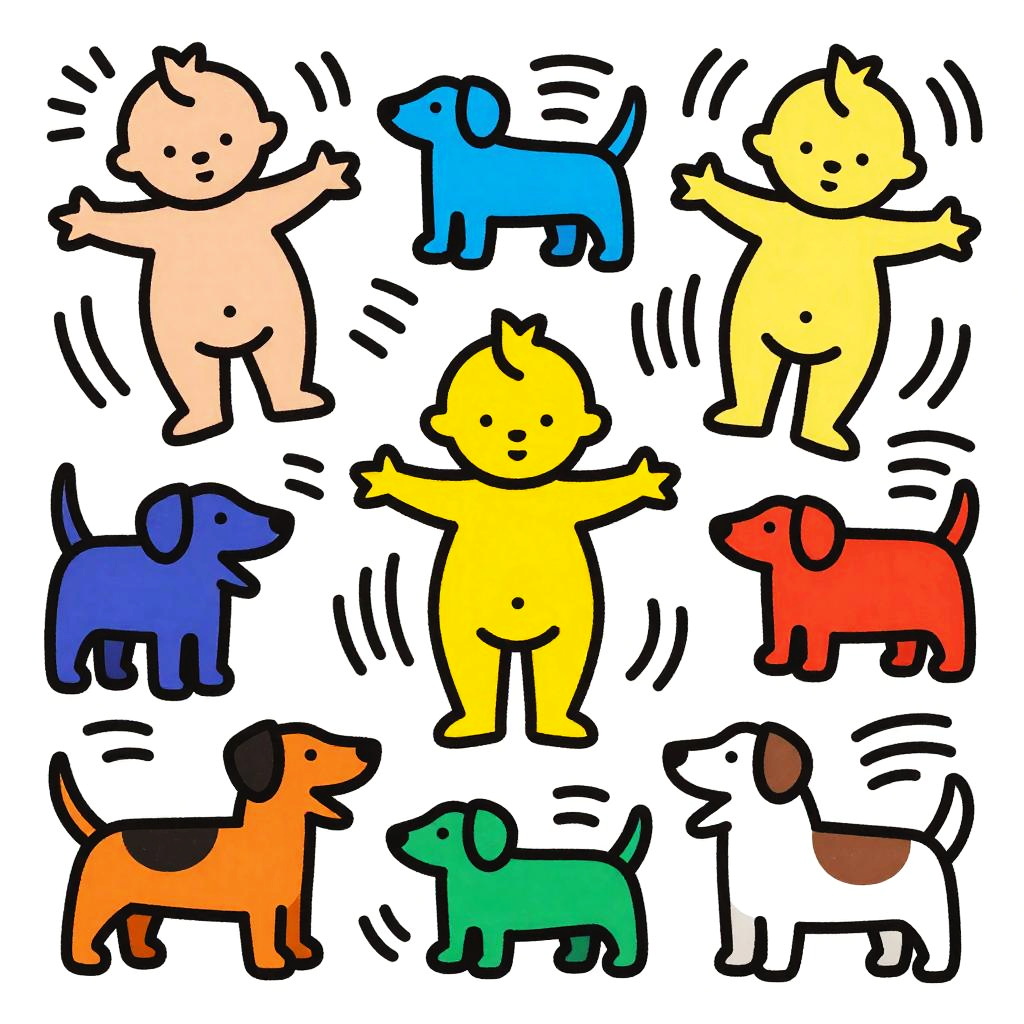 Colorful Keith Haring doodle featuring iconic radiant babies and barking dogs, all created with fluid black lines and vivid fills, lively and rhythmic composition blending social message with playful art style, modern urban pop culture illustration