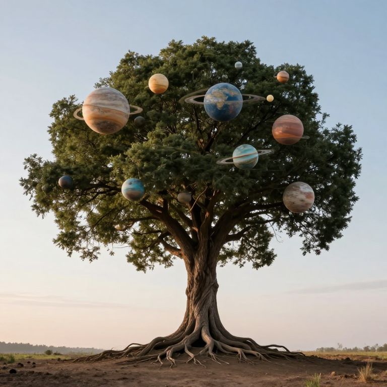 A majestic tree stands rooted in earth, its branches cradling a whimsical canopy of suspended planets, defying gravity in a surreal dance against a tranquil sky.