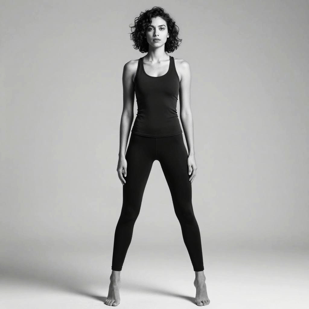 A black-and-white photograph of a tall, slender woman with short, curly hair. She's standing confidently with her legs slightly apart and arms relaxed by her sides. She's wearing a fitted black tank top and black leggings. The background is a plain, light gray gradient, highlighting her figure. The lighting creates soft shadows, adding depth to her silhouette.