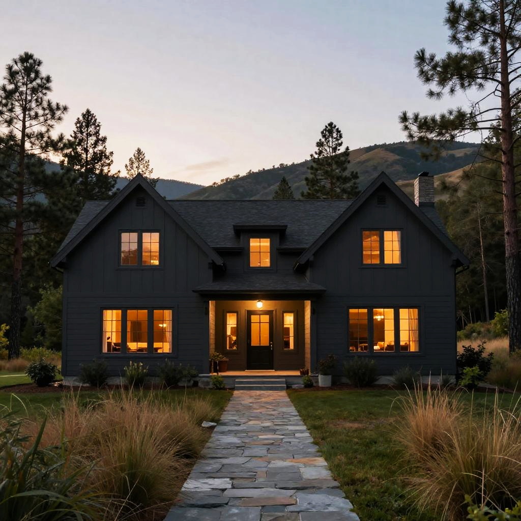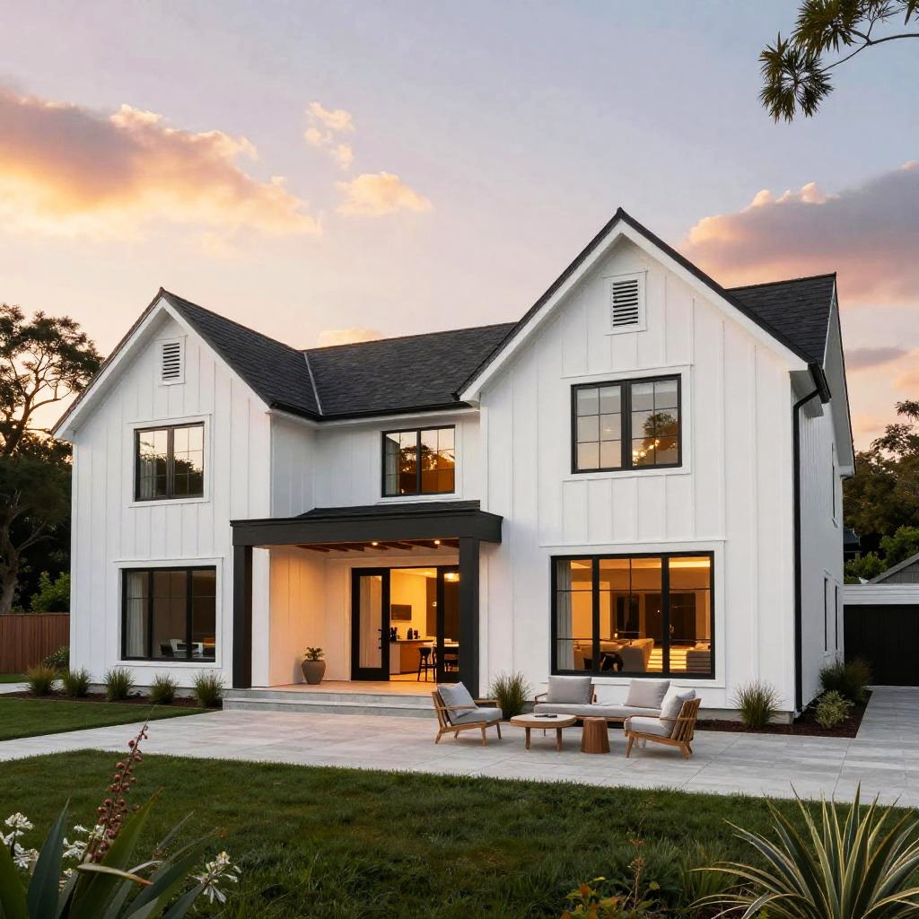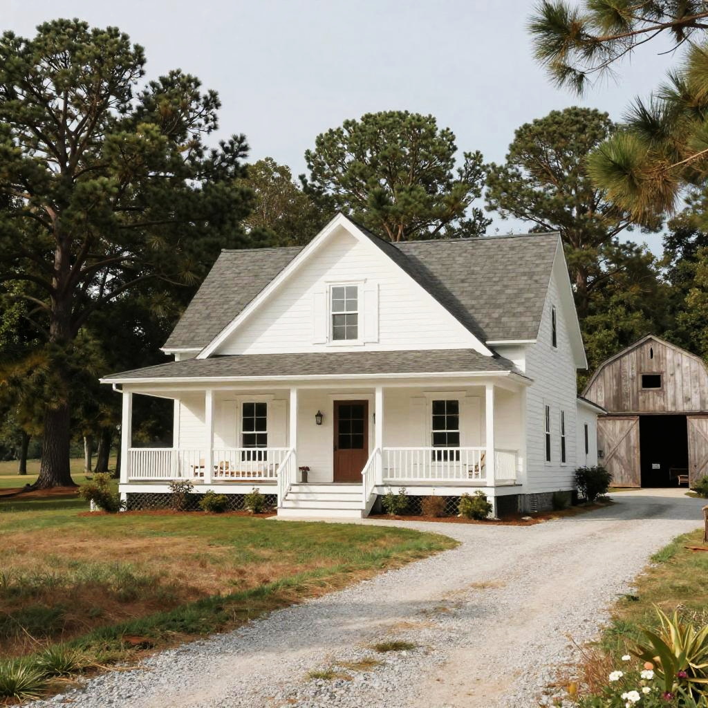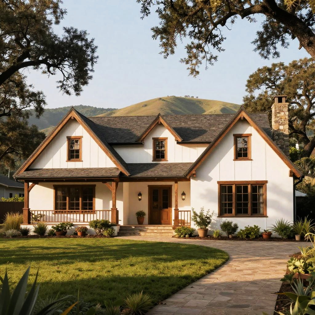 Charming white ranch style house with rustic wooden accents, wide eaves, and stone chimney, set against a backdrop of rolling hills and mature oak trees, warm sunlight casting soft shadows on the neatly manicured garden paths.