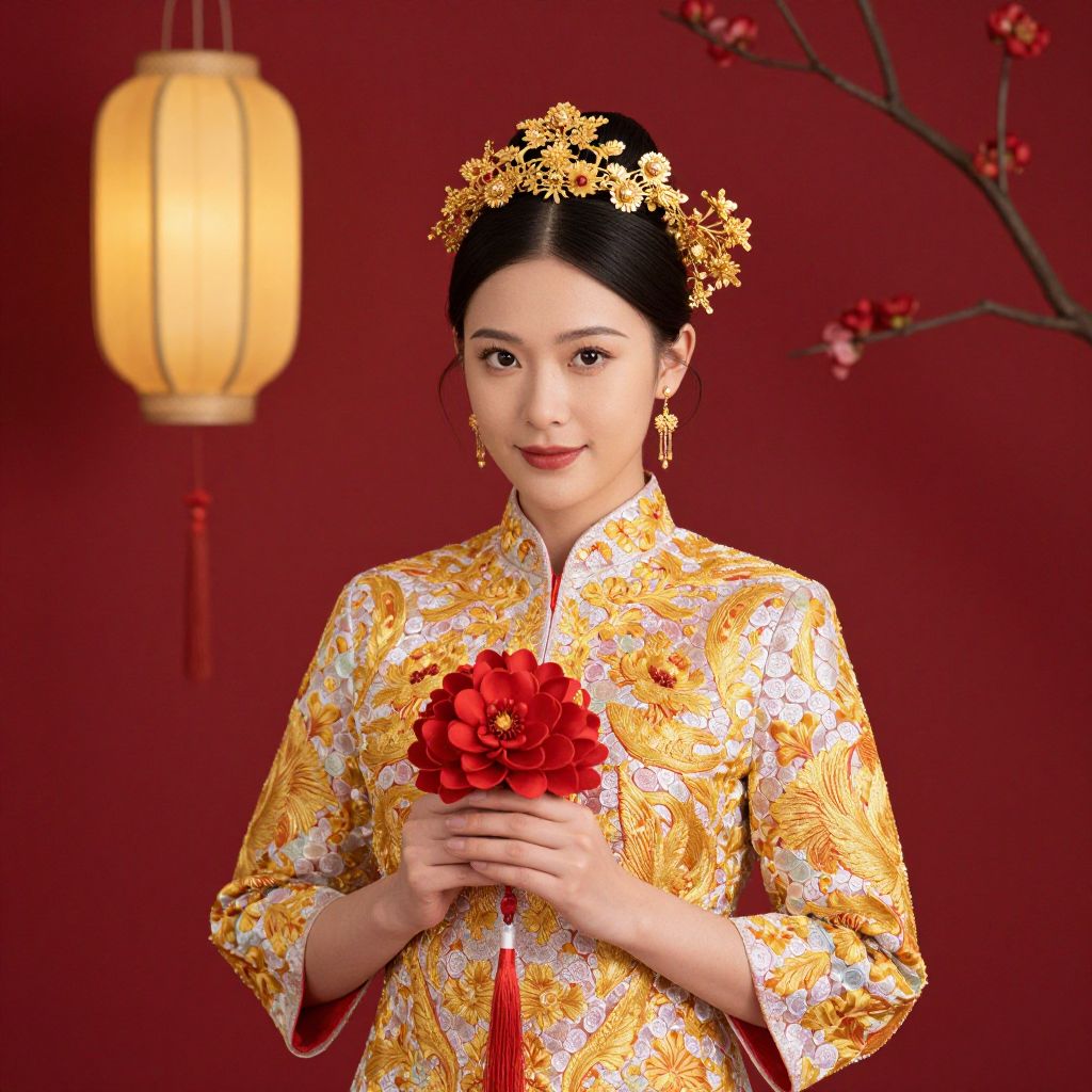 Elegantly dressed in a traditional Chinese wedding gown adorned with intricate gold floral embroidery, a woman holds a vibrant red pomander flower while wearing a golden headdress and matching earrings, set against a rich red backdrop featuring a hanging lantern and blooming branches.