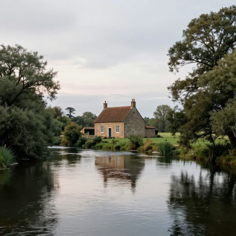Serenity whispers through the stillness of a pastoral scene, where the gentle flow of a river mirrors the quiet resilience of a solitary house, inviting contemplation amidst the timeless embrace of nature.