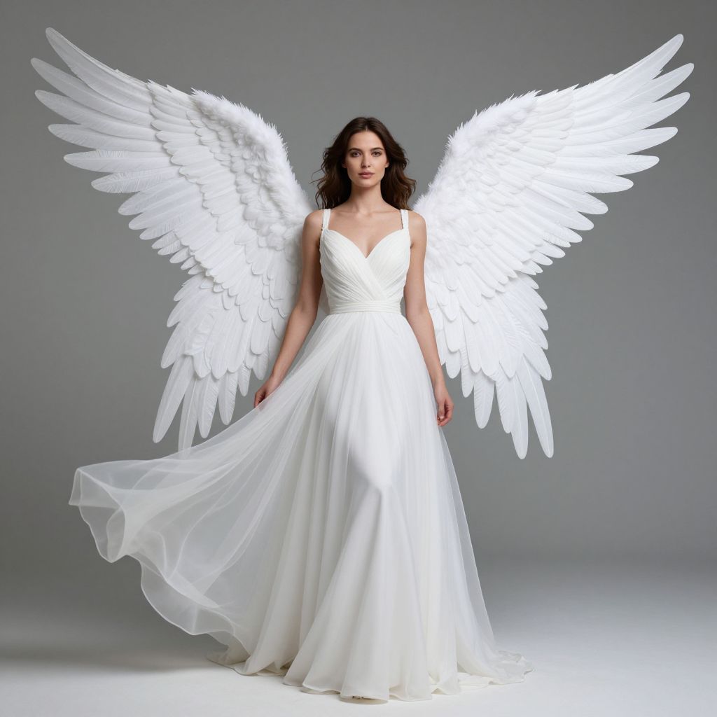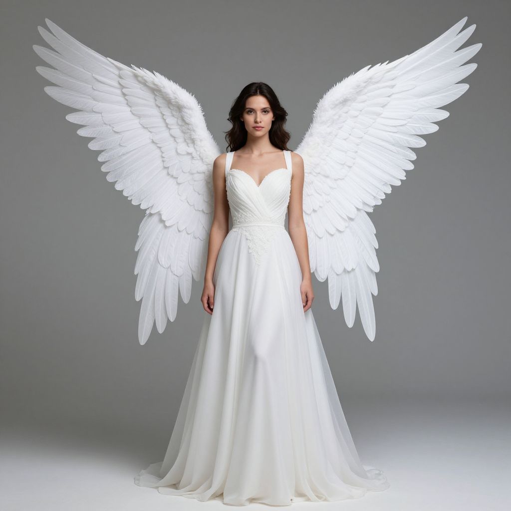 A high-definition photograph captures a woman in a flowing white wedding dress adorned with elegant, computer-generated angel wings, evoking a celestial and ethereal artistic style against a neutral backdrop.