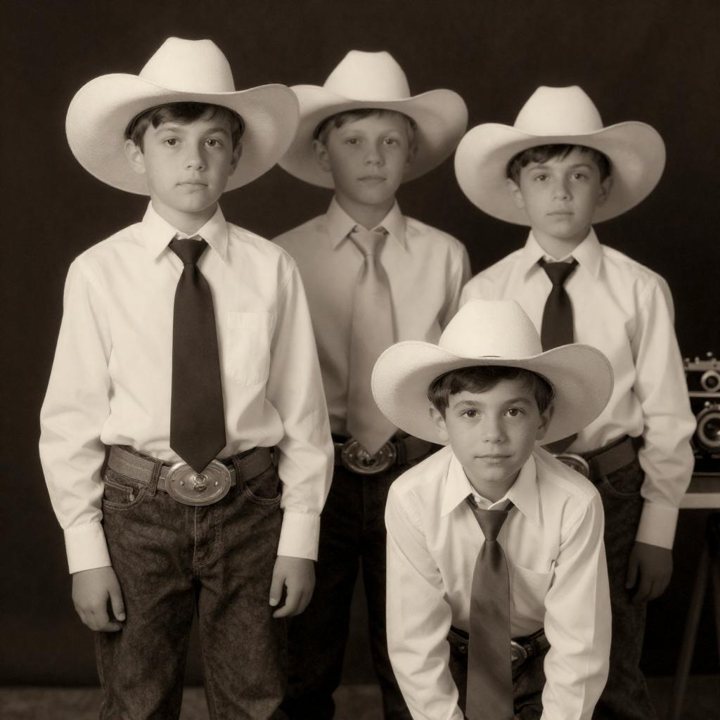 Sepia-toned photograph of four young boys dressed in western-style clothing. Three boys stand at the back, while one boy crouches in front, all wearing wide-brimmed cowboy hats, light-colored long-sleeve shirts, dark pants, and neckties. The boys have neutral expressions and dark backgrounds accentuate the vintage western attire. An old-fashioned camera is partially visible on the right side.