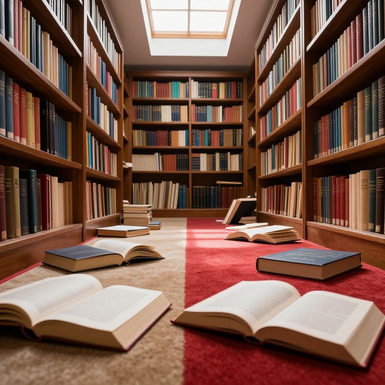Photograph of a spacious, well-lit library with tall wooden bookshelves lining both sides, filled with colorful books. The floor is covered in a red and beige carpet. Several open books with visible pages are scattered on the carpet, with some stacked neatly. Sunlight streams through a large skylight in the ceiling, casting bright light across the room. The background shows more bookshelves filled with books, creating a cozy and inviting atmosphere. The image has a warm, realistic style.