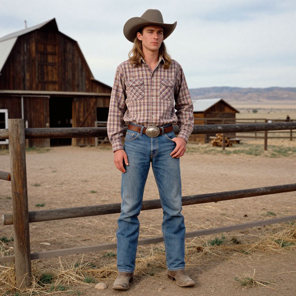Portrait of a skinny man with long hair wearing a sepia cowboy hat, plaid shirt, wool denim jeans, leather belt with buckle, and rugged boots standing outdoors on a ranch with wooden barns and desert landscape in the background, captured in a kodachrome analog film style.