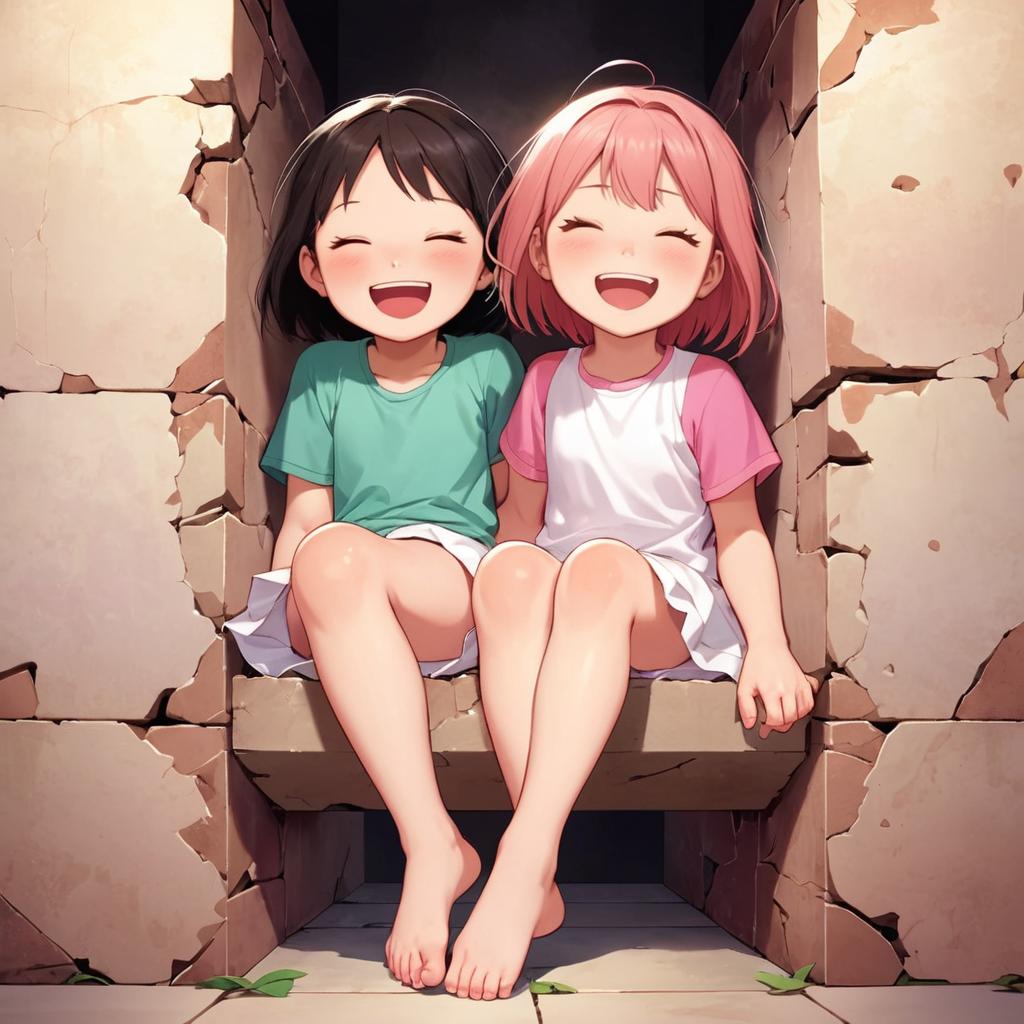 Through wall, 1girl, foot tickling, (disembodied limb:1.1), blush, half-closed eyes, one eye closed, smile, trembling, grin, (1boy:0.8)