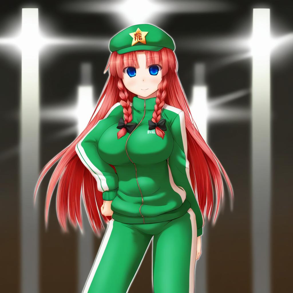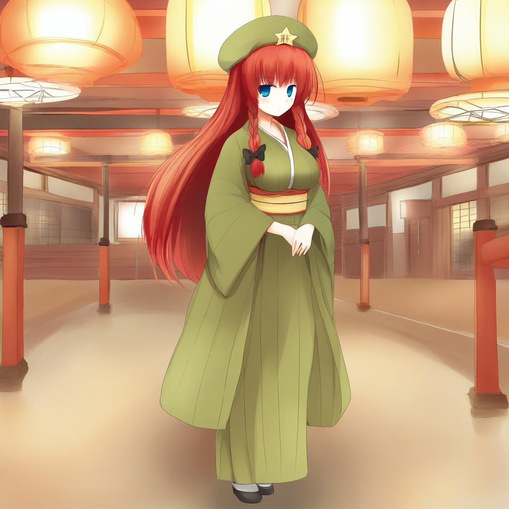 Hong meiling, touhou,1girl, blue eyes, red hair, long hair, twin braids, large breasts, hat, kimono, traditional japanese room, soft lantern light