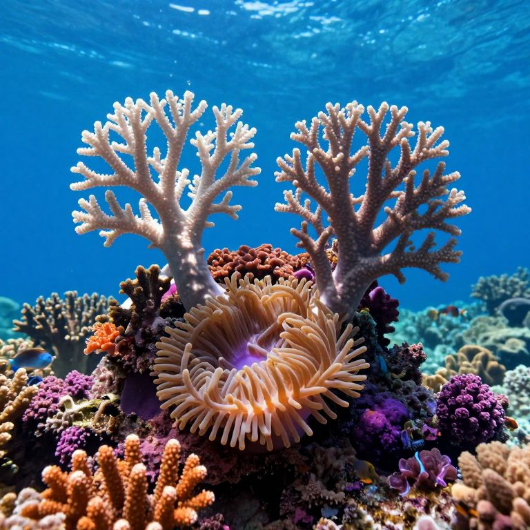 Coral reef flourishes beneath the ocean's surface, adorned with two towering crystalline trees whose intricate branches cast ethereal shadows over vibrant clusters of orange, pink, and purple anemones, while small fish dart gracefully through the tranquil blue waters above.