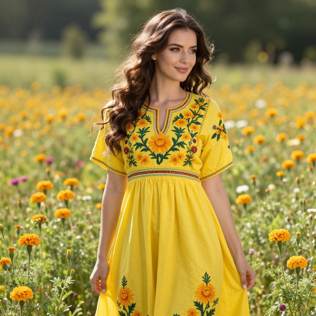 Woman wearing a vibrant yellow marigold embroidered dress stands gracefully in a sunlit field of wildflowers, her long brown hair flowing freely as she smiles softly towards the right.