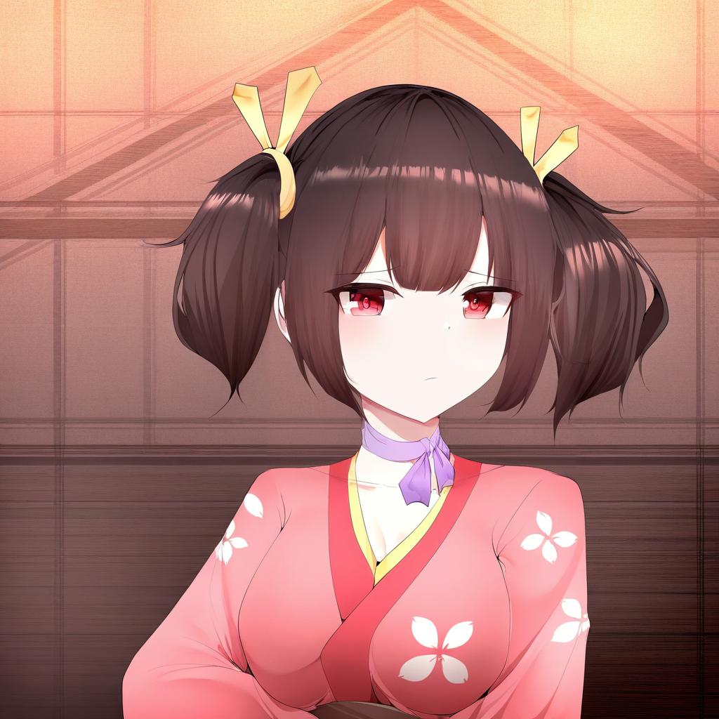 This is a digital anime-style drawing of a young woman with short, dark brown hair in twin ponytails, adorned with yellow ribbons. She has red eyes and a serious expression. She wears a pink kimono with white floral patterns and a white neckerchief. The background features a gradient orange to yellow sky with geometric patterns and a dark brown wall. The image has a soft, glowing effect, particularly around her hair and eyes, adding a sense of warmth and focus to the character's face. The overall style is clean and vibrant, typical of modern anime art.