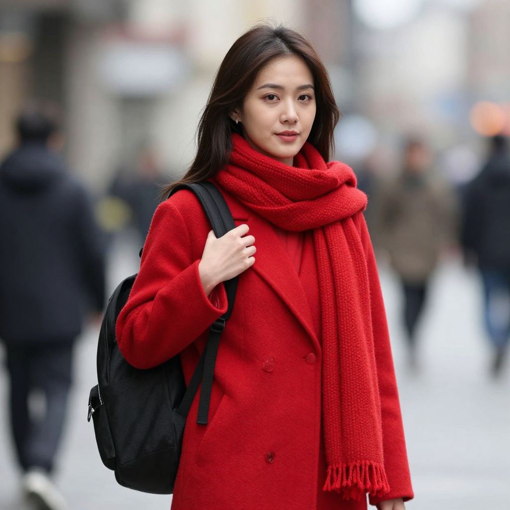 Red Yarn Costume, asian woman with red scarf and backpack on street