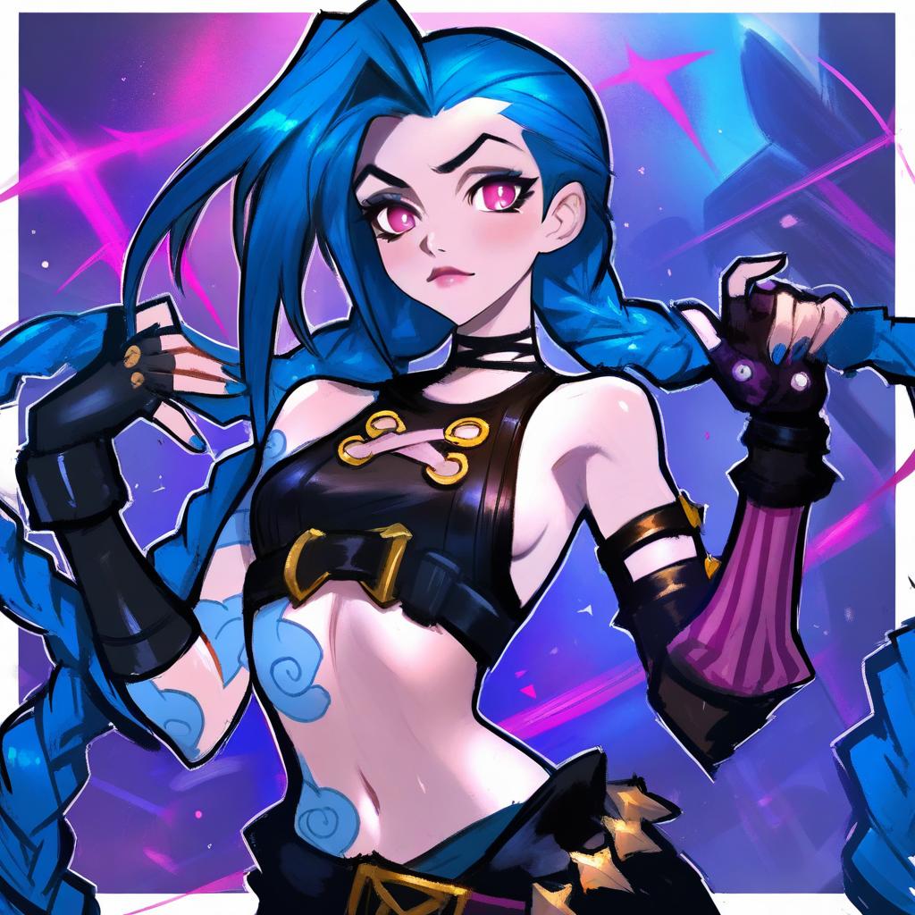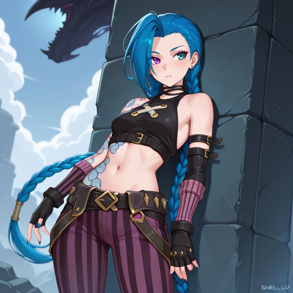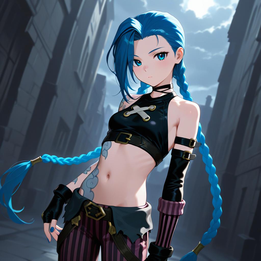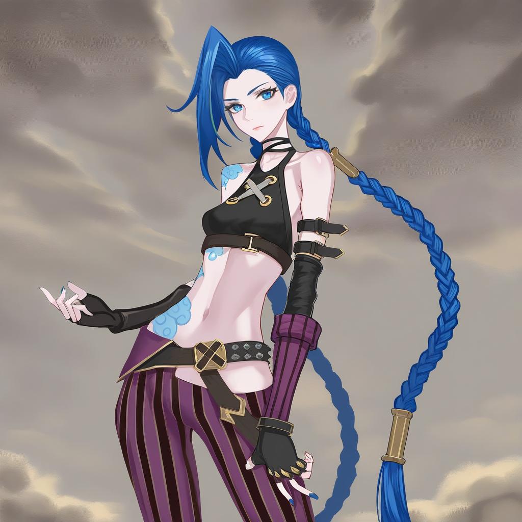 Arcane jinx, league of legends, 1girl, pink eyes, blue eyes, blue hair, long hair, very long hair, twin braids, asymmetrical bangs, twintails, small breasts, navel, arm tattoo, shoulder tattoo, cloud tattoo, stomach tattoo, fingerless gloves, striped pants, black gloves, striped clothes, bare shoulders, nail polish, crop top, by artist pumpkinspicelatte, illustrious