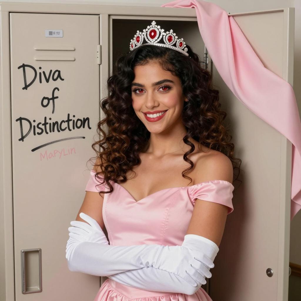 Portrait of a young woman with dark curly hair, red glowing eyes, and a confident smile wearing a silver tiara, off-shoulder pink satin dress, and long white gloves. She stands in front of a beige locker with crossed arms. The locker features graffiti saying 'Diva of Distinction' and the name 'Marylin.' A pink fabric is draped over the locker door.