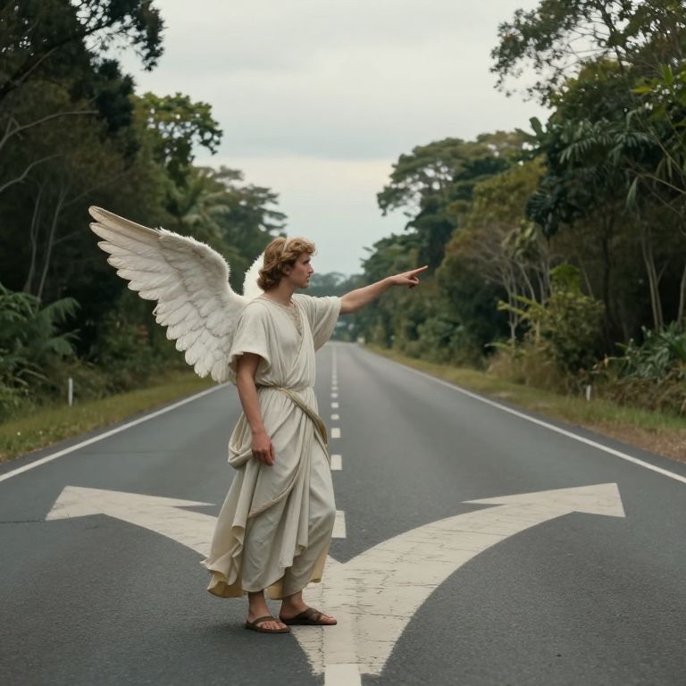 Proportion /Show a scene: an angel standing at the fork of a road, pointing for the masses to take the high and narrow fork in the road, UHD, 8K, ultra-realistic,
