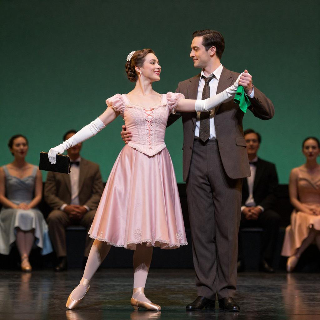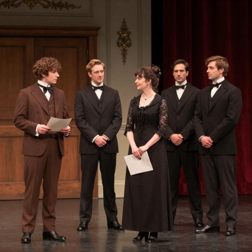Dramatic stage fight between two people in period costumes. Woman in purple dress kicks man in black outfit. Two men observe from background. Grand, classical interior with columns and ornate furniture. Soft, dramatic lighting. Wood floor, scattered papers. Intense expressions.