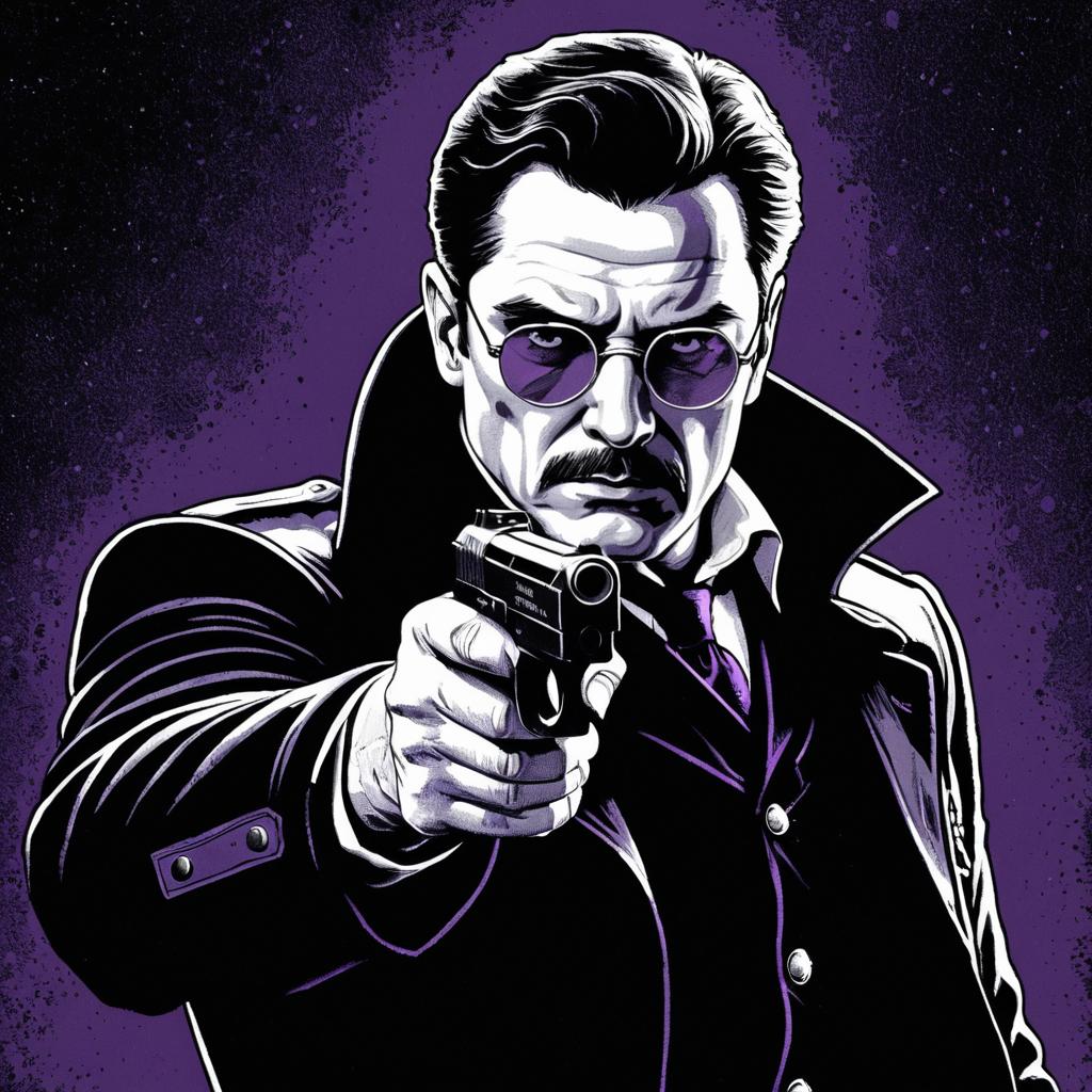 Digital illustration of a vampire policeman with a mustache, wearing round spectacles and a dark coat, aiming a Beretta 92F handgun. The image uses Michelangelo-style stipple shading with a color palette of silver, black, purple, and white, creating a haunting and ominous atmosphere. The background blends dark and purple tones, enhancing the eerie mood.