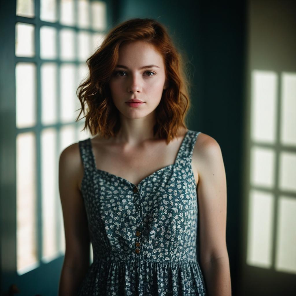 A portrait of a young woman with short wavy auburn hair and natural makeup, wearing a patterned sundress, standing in an indoor setting with soft moody lighting and deep shadows, realistic photography style with cool and muted colors, soft focus and cinematic atmosphere