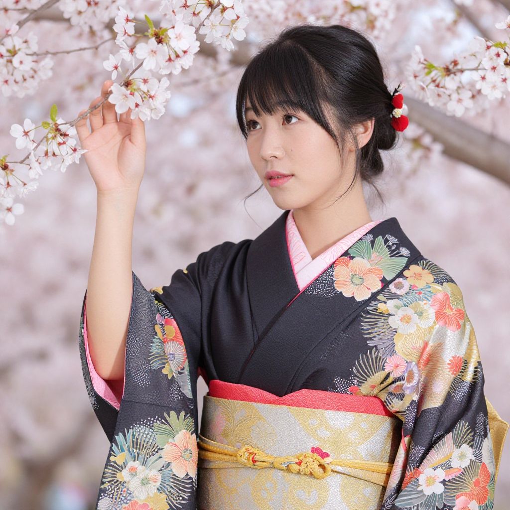 Asian g cup woman in traditional kimono, cherry blossoms in the background, vibrant colors, delicate patterns, serene expression, artistic composition