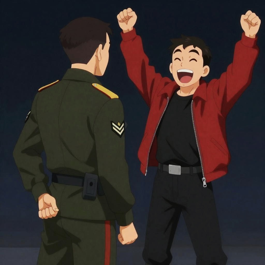 An anime-style illustration of a bus interior. An older man in a military uniform with a red star on his cap sits next to a young girl with blonde hair and glasses. Both sit on a brown leather bench. The man's expression is stern, the girl's is neutral. The background shows a dark, empty street outside the bus windows.