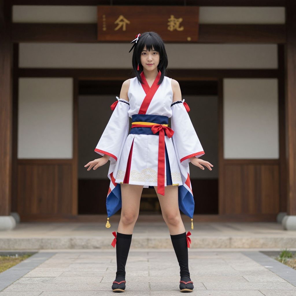 Photograph of a young woman in a white and red traditional Japanese samurai outfit with blue and red accents, standing confidently in front of a wooden building