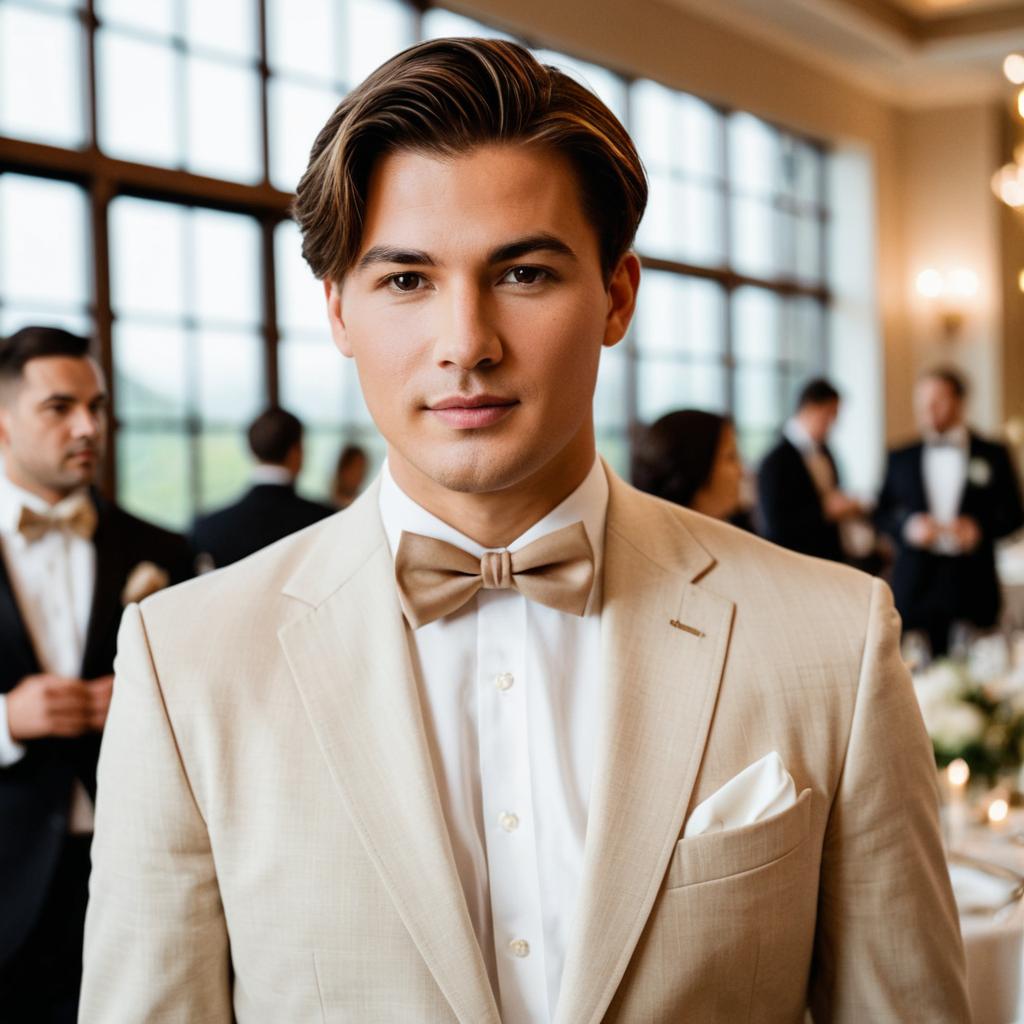 Portrait of a young man with light skin and short brown hair wearing a beige suit, white dress shirt, brown bow tie, and white pocket square, standing in an elegant indoor venue with large windows and warm lighting. Formal event atmosphere with blurred guests in the background.