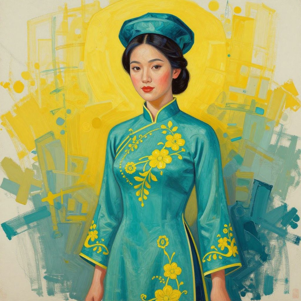 The image depicts a woman in a vibrant, Picasso-style portrait. She is adorned in a traditional Vietnamese ao dai, characterized by its teal color and intricate yellow floral embroidery. The woman's hair is styled in a neat bun, and she wears a matching teal hat. The background features bold, abstract brushstrokes in shades of yellow and teal, creating a striking contrast with the subject. The overall composition is balanced, with the woman centrally positioned and the colors harmoniously blending to create a luxurious and artistic atmosphere. The image is reminiscent of a high-resolution digital painting, with a resolution of 32k, showcasing the intricate details and textures of the subject's attire and the background.
