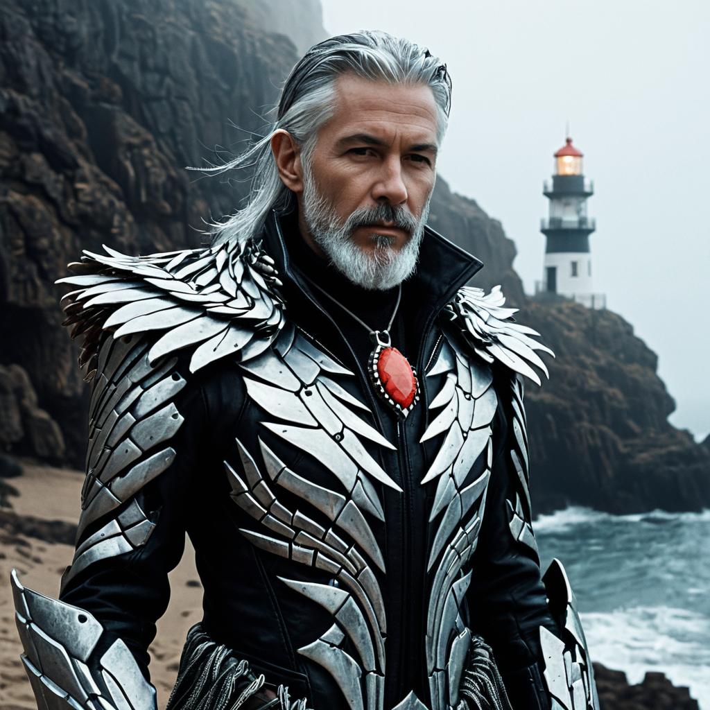 Highly detailed digital painting of a mature male fantasy warrior wearing ornate white and gold armor. The character has silver hair and beard, standing against a dark, rainy background with lightning strikes illuminating the scene. The setting has gothic architecture, emphasizing a dramatic and powerful atmosphere. Concept art inspired by D&D and fantasy themes.