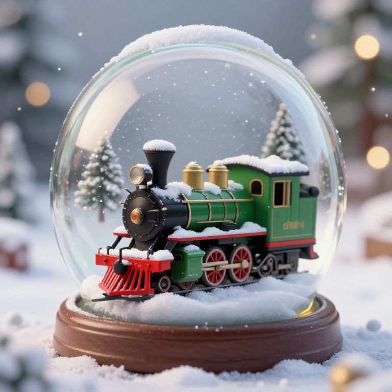 A whimsical 3D-rendered snow globe captures a vintage-style green steam locomotive adorned with red accents and snow, perpetually looping through a magical winter wonderland illuminated by golden bokeh lights, evoking a nostalgic and enchanting holiday atmosphere.