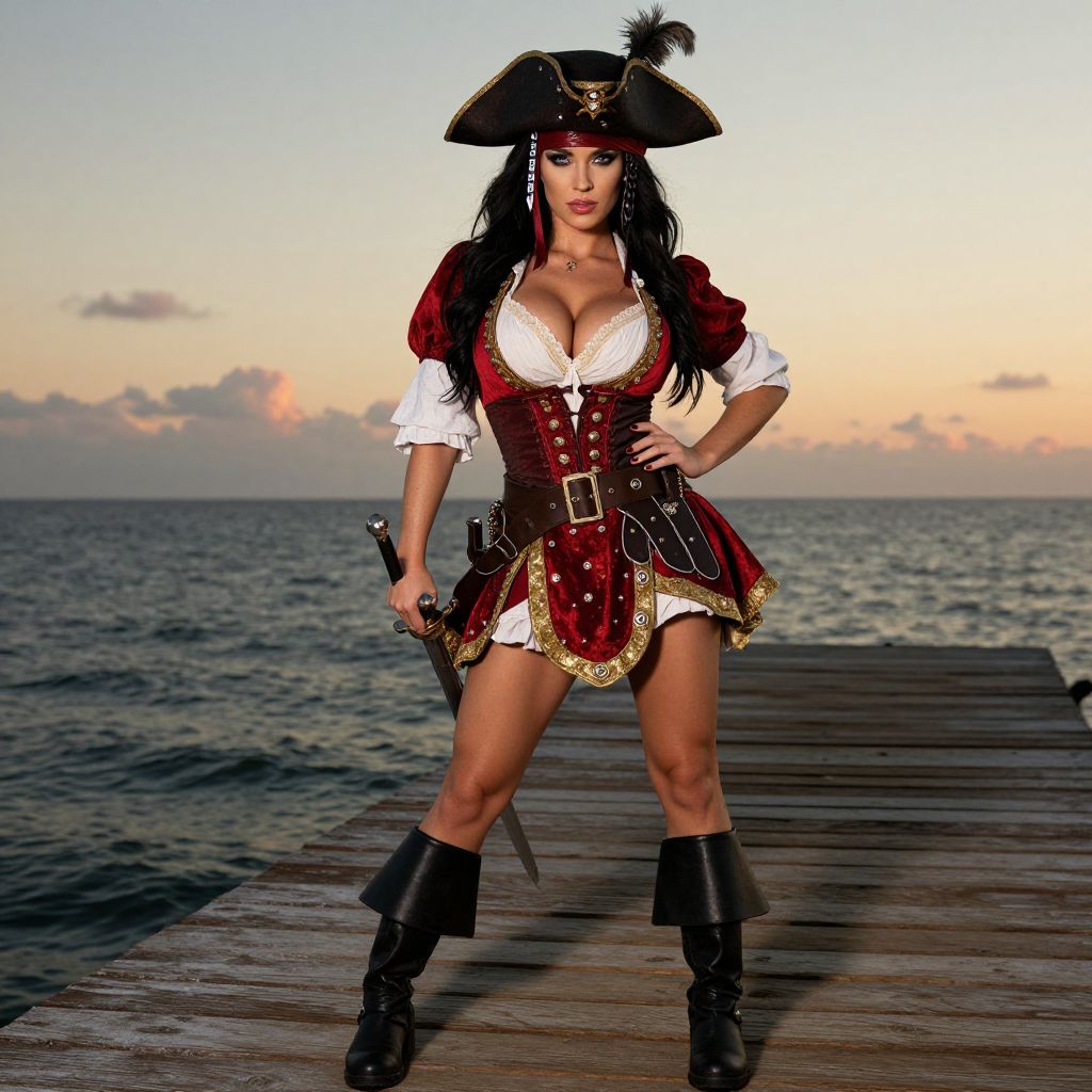 A realistic photography of a pirate woman in detailed cosplay, wearing a full pirate costume with a red and gold embellished dress, a wide-brimmed hat with a feather, a sword at her side, and big black boots, standing on a weathered wooden dock at sunset with the ocean in the background, her face has warm, sun-kissed skin, sharp cheekbones, and a fierce, adventurous expression, eyes gleaming with humor and confidence. The woman has big tits and cute face