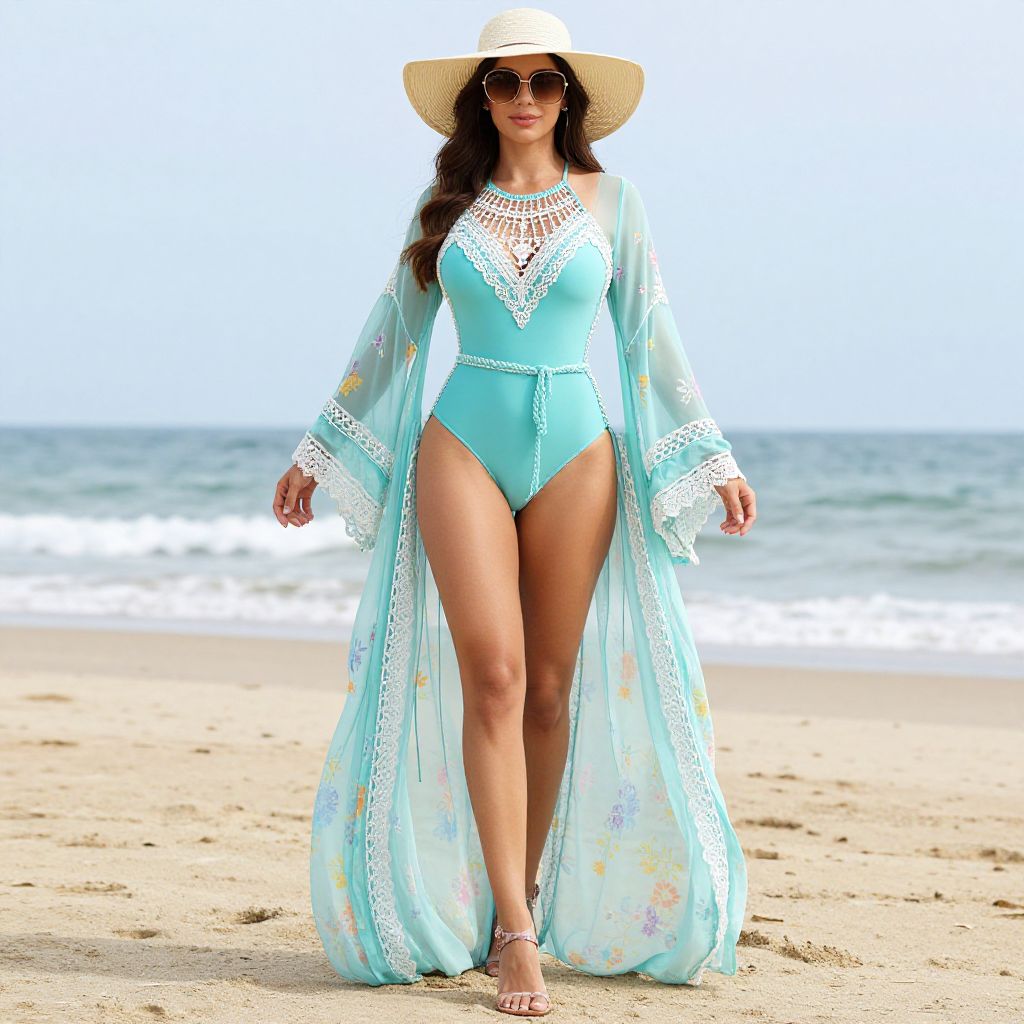 Full body shot, toned woman, long sleeve swimsuit, vibrant turquoise fabric, intricate crochet detailing, high neckline, form-fitting silhouette, boho dress, lightweight sheer chiffon, flowing maxi length, floral print in pastel colors, wide bell sleeves, cinched waist with braided belt, layered with delicate lace trim, beachy vibe, sun-kissed skin, soft natural makeup, sun hat with wide brim, oversized sunglasses, sandals with ankle straps, relaxed yet stylish look Sexy. Pretty face and beаutiful eyes. Big breasts