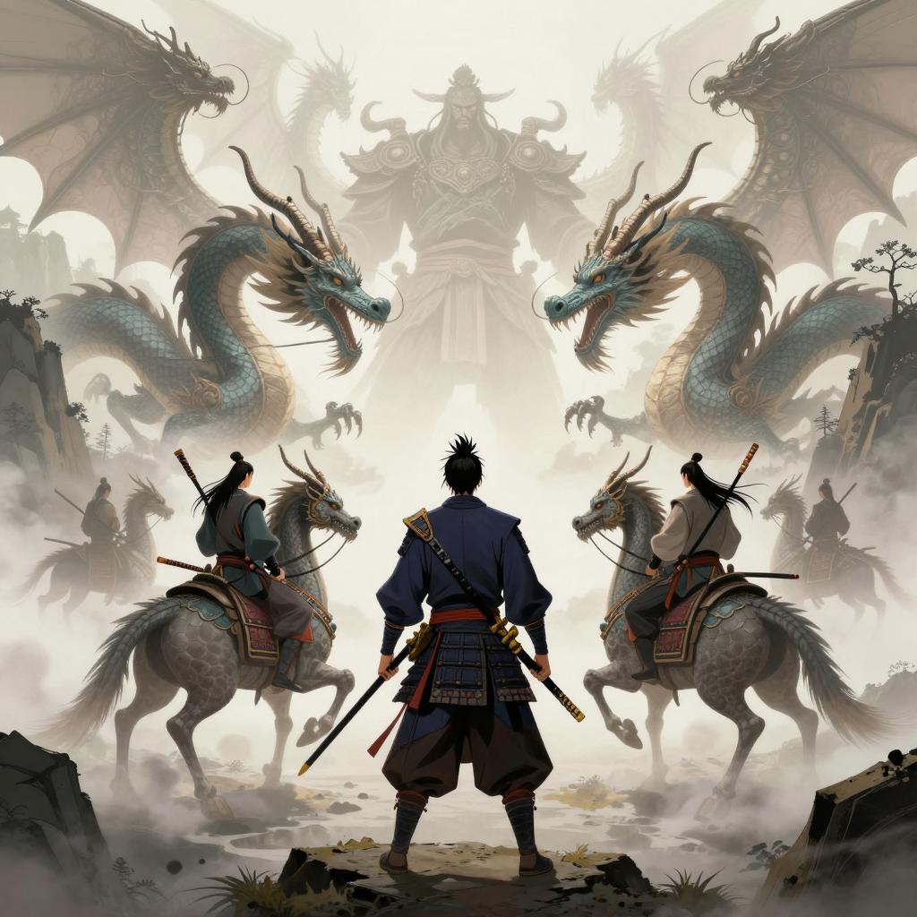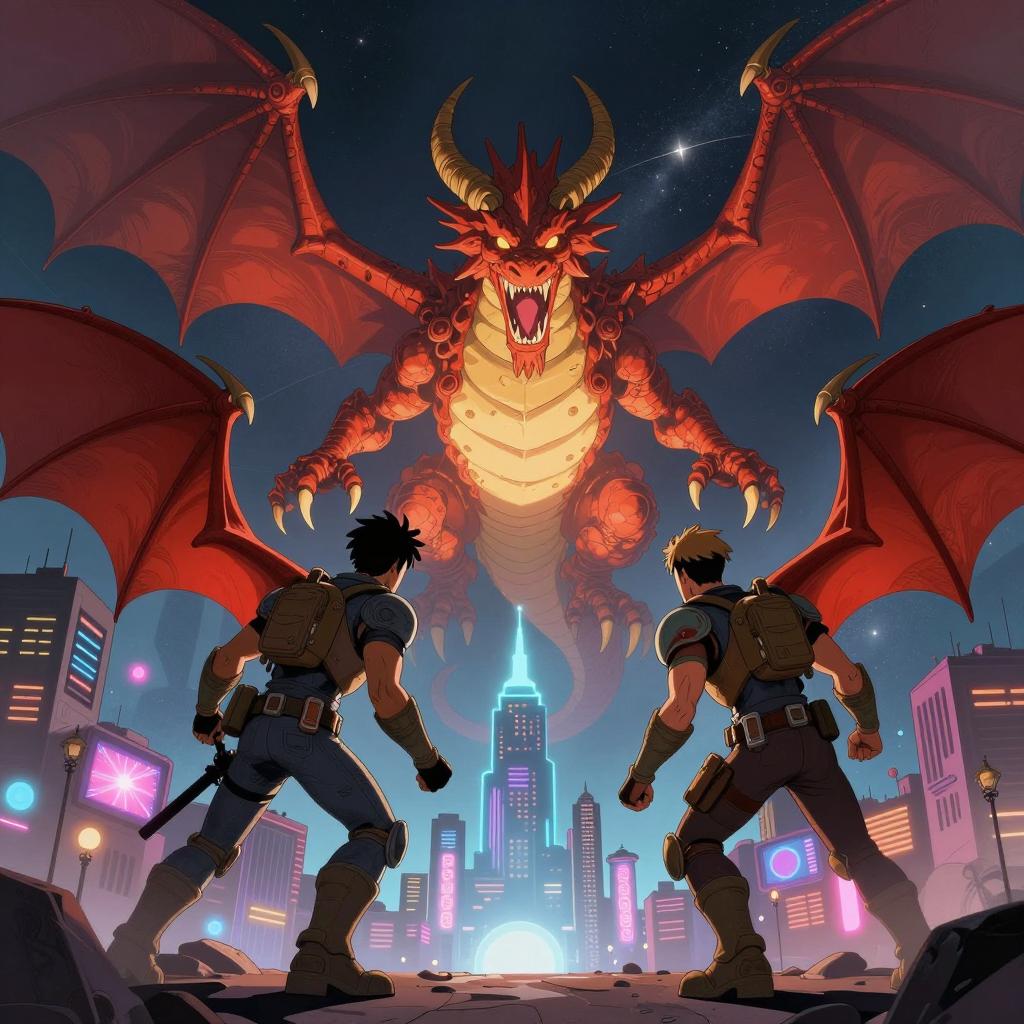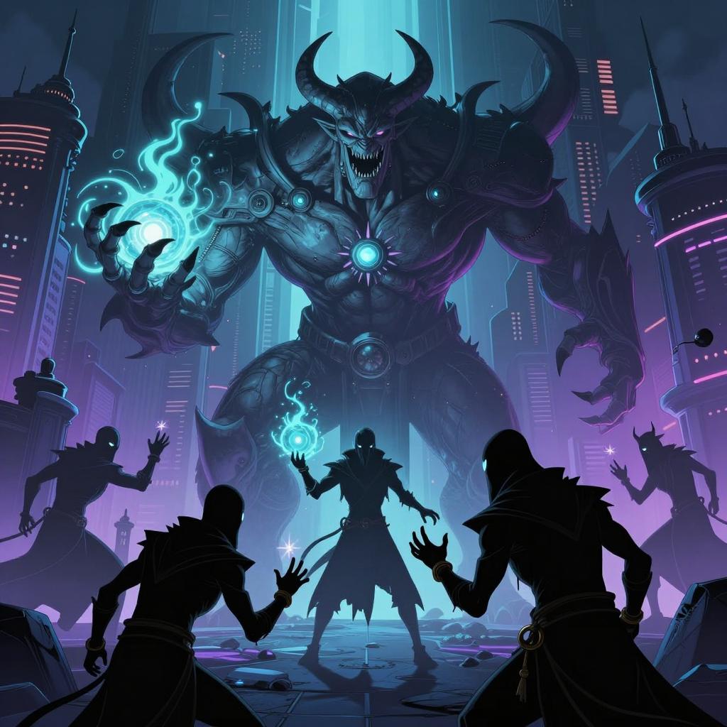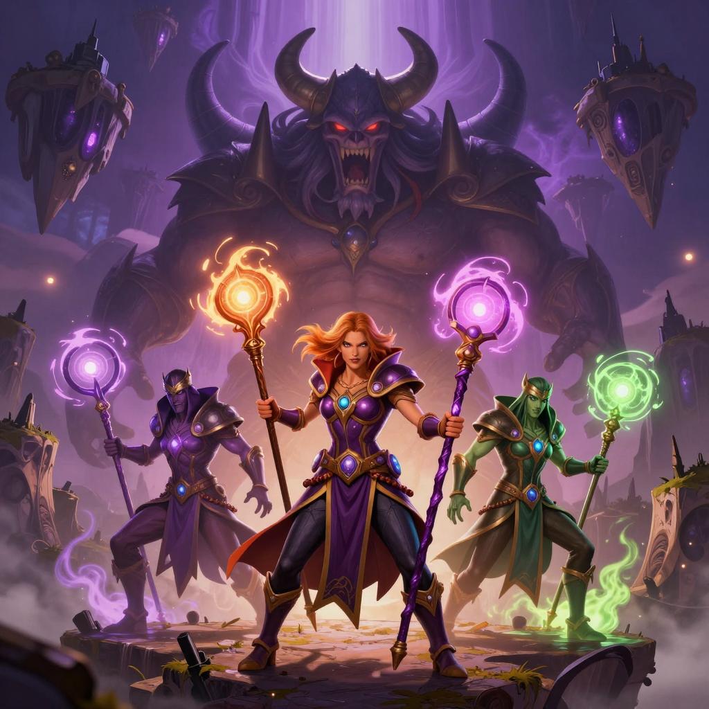 Epic illustration of arcane sorcerers wielding staffs emitting magical energy in mystic floating island, confronting an enormous worldboss, in bold Borderlands-inspired comic style, ultra-detailed 4K resolution, art by Loish
