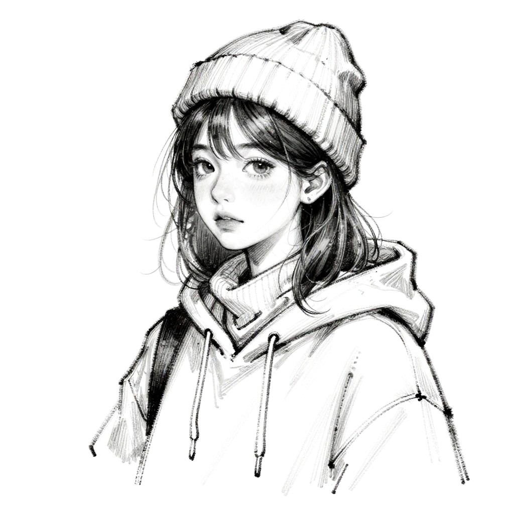 This is a digital black and white sketch of a young woman with medium-length hair, wearing a beanie and a hoodie. She's also got a scarf around her neck, looking off to the side with a slightly pensive expression. The sketch has a rough, sketchy style with visible line work and some shading. The background is plain white, keeping the focus on her.
