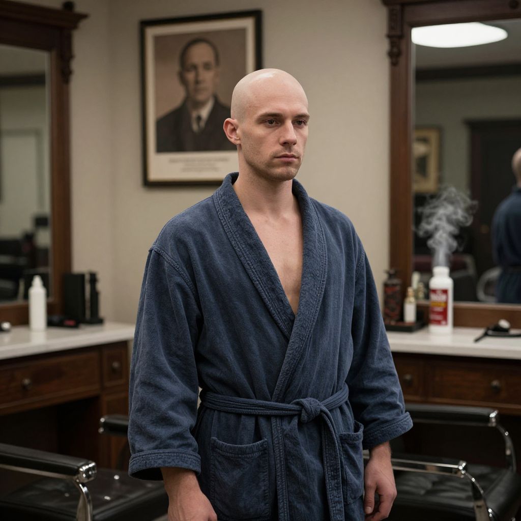 Photograph of a bald, fair-skinned man with a serious expression, standing in a barbershop. He wears a dark blue, textured bathrobe with a belt, exposing his chest. The background features wooden shelves with bottles, a mirror, and a framed portrait of a man in a suit. A lit cigarette produces a wisp of smoke on the right. The lighting is warm, creating a vintage, classic barbershop atmosphere. The man's robe contrasts with the dark wood and neutral walls, drawing focus to his central position in the image.