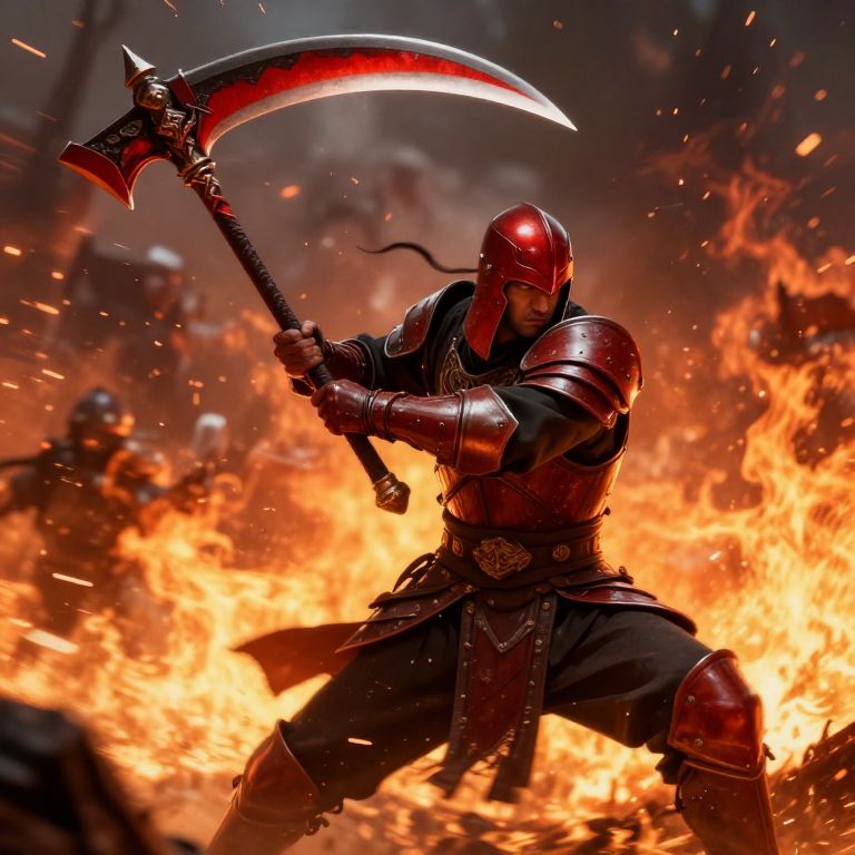 This is a dynamic, digitally-rendered image of a muscular, armored warrior with a red helmet and silver armor, wielding a large, curved, red-and-silver scythe. He stands amidst a fiery, orange-hued battlefield with flames and sparks surrounding him. His black pants and red belt contrast with his shiny, reflective armor. The background is blurred, showing indistinct figures and more fire, enhancing the intense, action-packed atmosphere. The warrior's determined expression and powerful stance convey a sense of readiness for combat. The overall style is hyper-realistic with a dramatic, fantasy-warrior aesthetic.