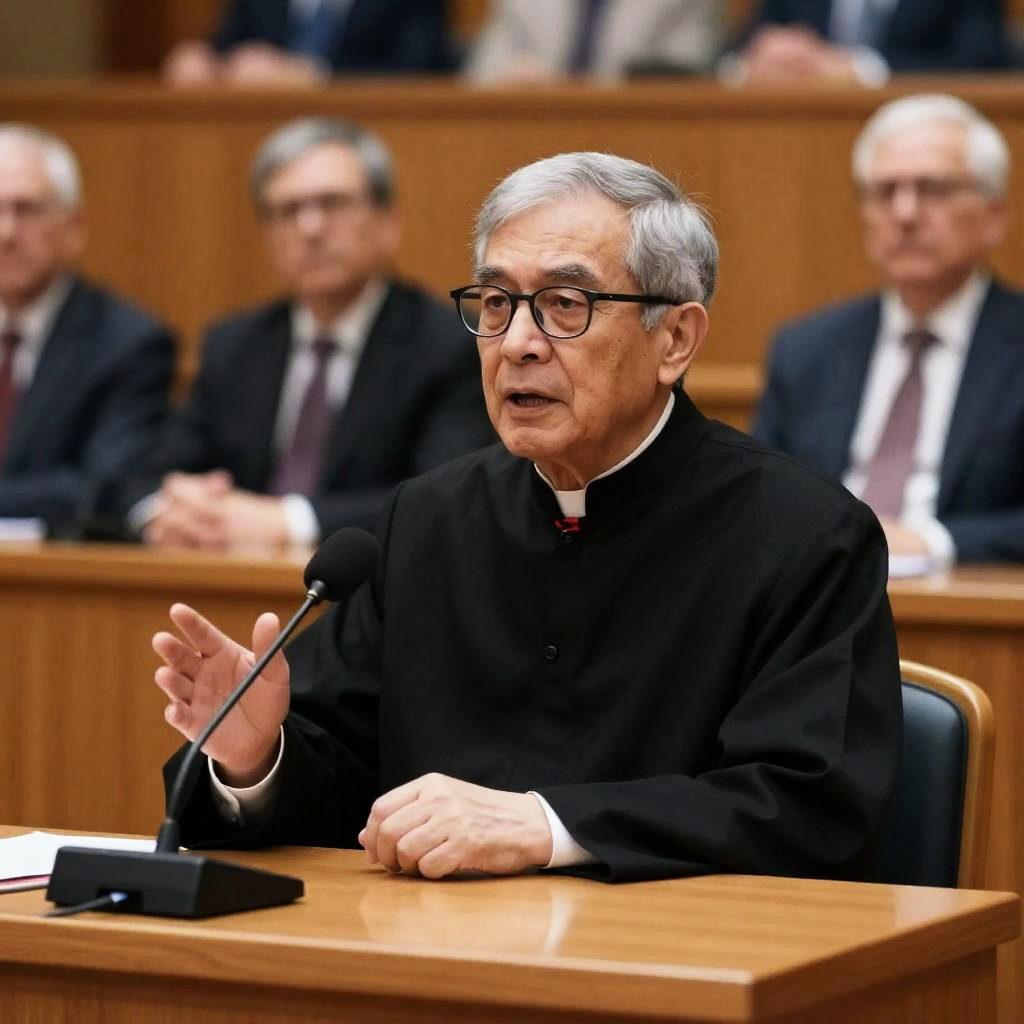 Elderly man with gray hair, glasses, and black robe speaking at a wooden table. Right hand gesturing. Background: older men in suits, blurred audience in wooden bleachers. Intense expression. Two microphones on table. Warm indoor lighting.