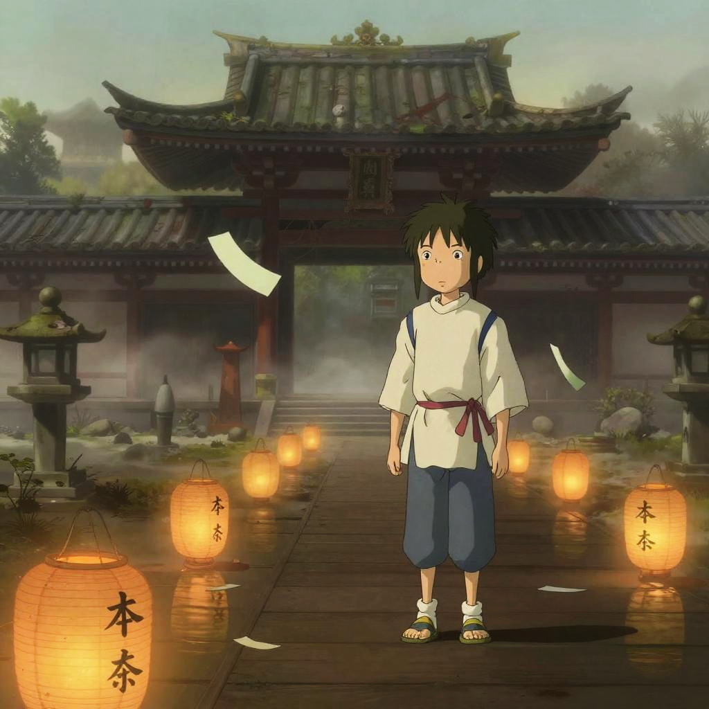 Spirited Away-inspired fantasy at an abandoned temple garden in early morning mist; a teenage boy in a simple linen robe stands amid glowing lanterns and fluttering paper talismans. brush and wash with muted colors aesthetic with delicate linework, soft edges, and subtle washi texture. Cinematic composition with leading lines and a clear vanishing point, soft gray and sage green grading, volumetric light, gentle fog, soft bokeh, polished wood reflections, high detail, subtle film grain, calm, wistful mood.