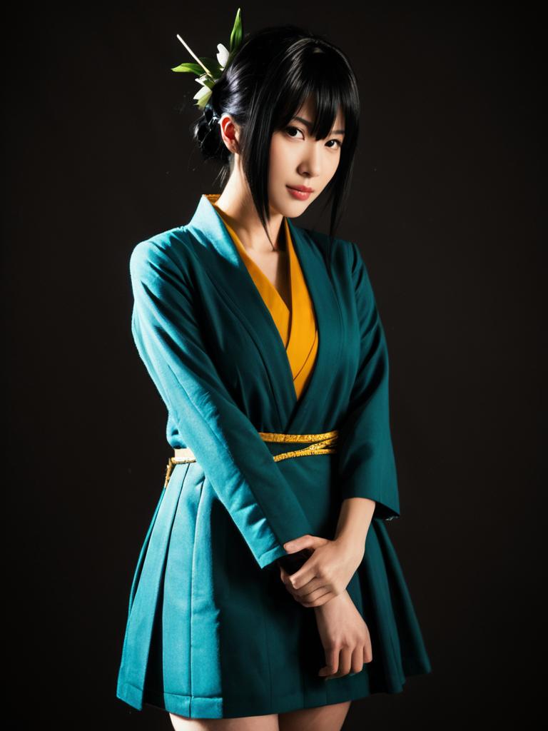 Sexy cosplay woman character wearing Kanan Matsuura costume. Realistic photo. Jane Doe dressed as Kanan Matsuura --sref 1404